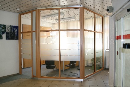 ...Trennwände als Holz-Stollentrennwände , in Holz oder farbig lackiert, sowie Ganzglastrennwände.